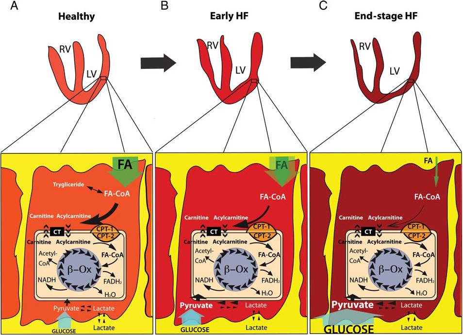 心衰时CPT-1的表达下调,活性下降,病变心肌利用脂肪酸氧化的机能下降。