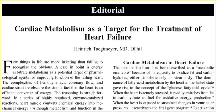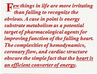 没有什么比忽略显而易见的事物更让人恼火的,比如能量底物代谢,后者早应作为改善衰竭心脏心功能的潜在药物治疗靶点。血流动力学、冠脉血流以及心脏结构的复杂变化掩盖了这一显而易见的事实,即心脏是个高效的能量转换器。 ——HeinrichTaegtmeyer