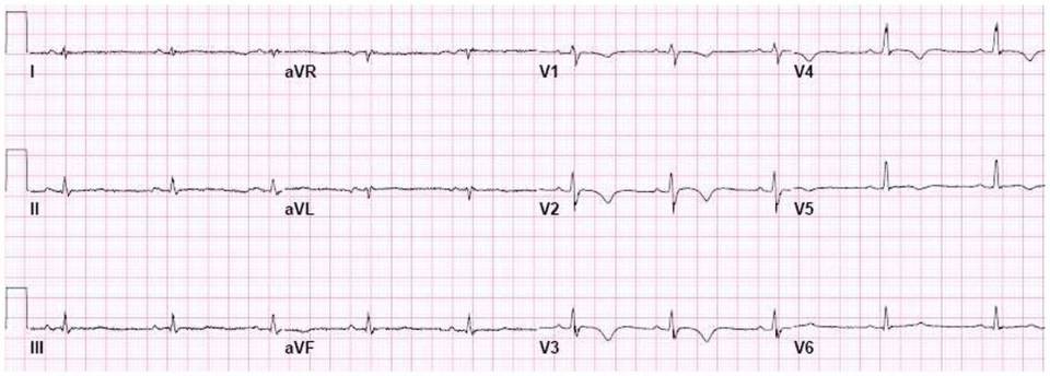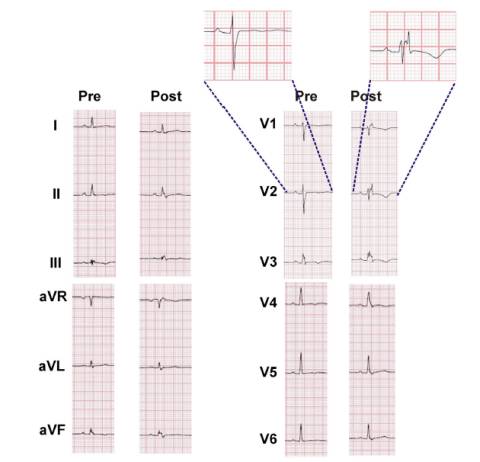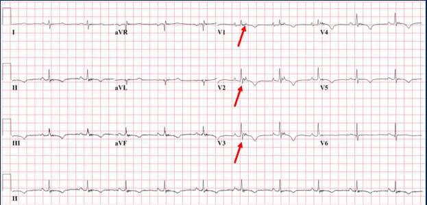 窦性心律时可以见到非特异性的ST段和T波的变化,如T波倒置。非特异性ST或T波变化以V1~V3最为常见。