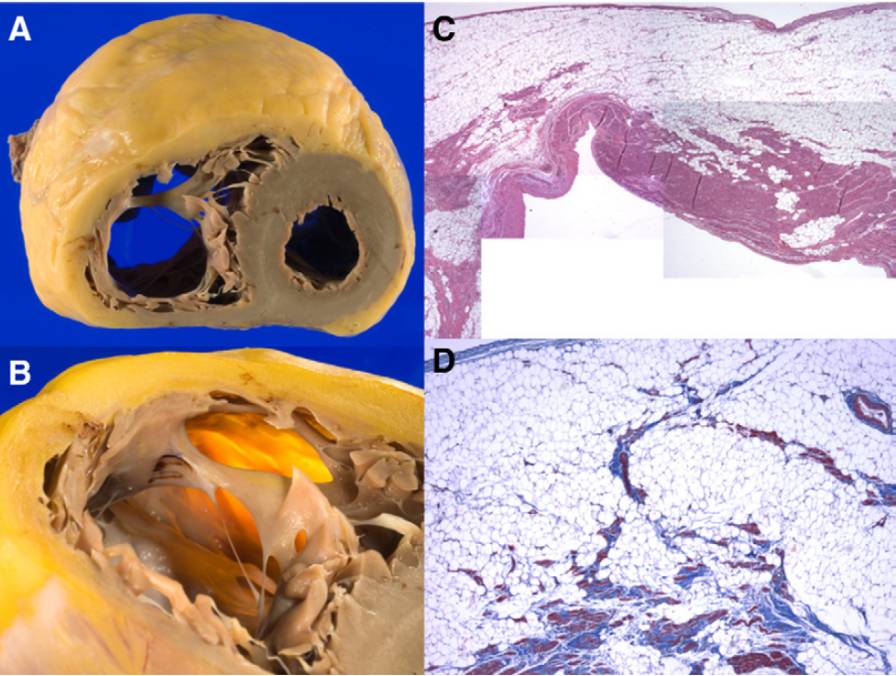 致心律失常性右室发育不全的病理解剖学改变ARVD病理解剖学的特征之一是部分或多个部位心室肌被脂肪和纤维组织所代替。