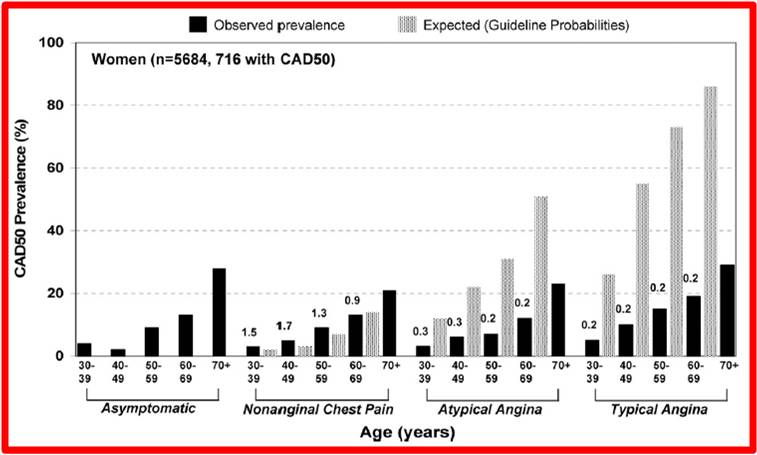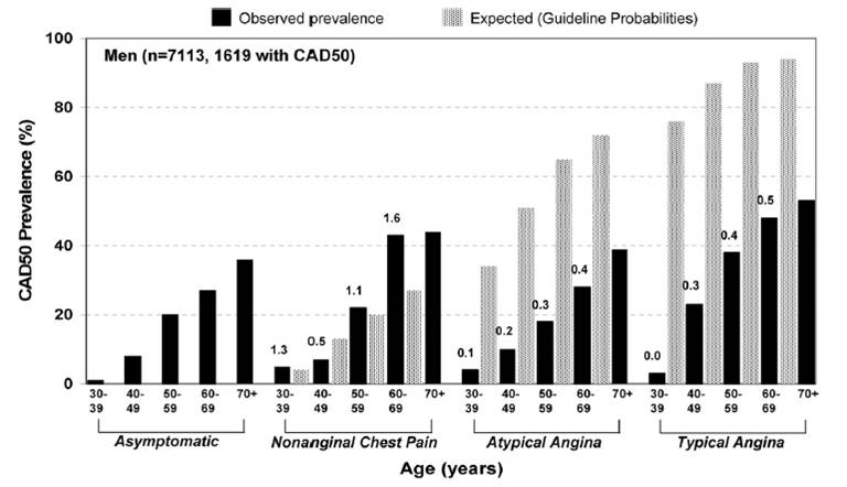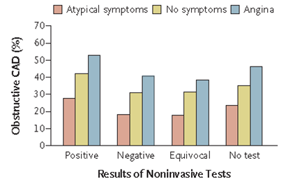 接受择期冠状动脉患者的非有创检查结果和症状与阻塞CAD 的患病率(n=398,978)