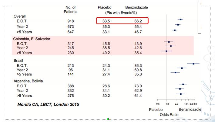 BENEFIT:PCRNegativization(66.2% vs.33.5%)苄硝唑治疗组锥虫阴性率较安慰剂组明显升高