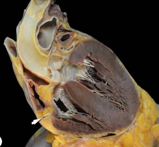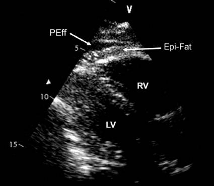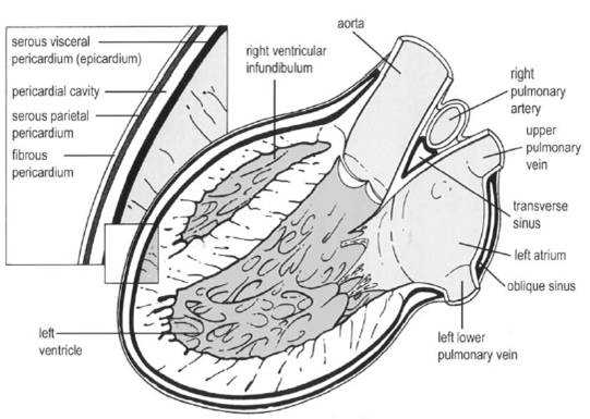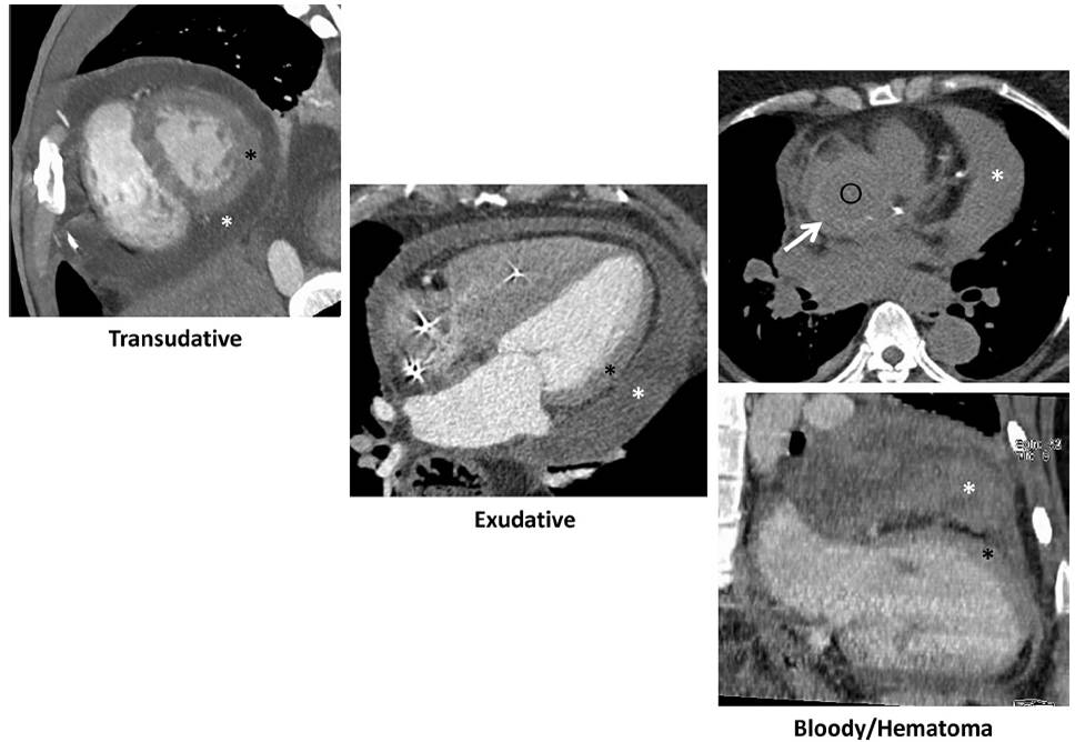 parietal and inner visceral layers of the pericardium due to inflammation (white arrow) with interposed mild effusion.