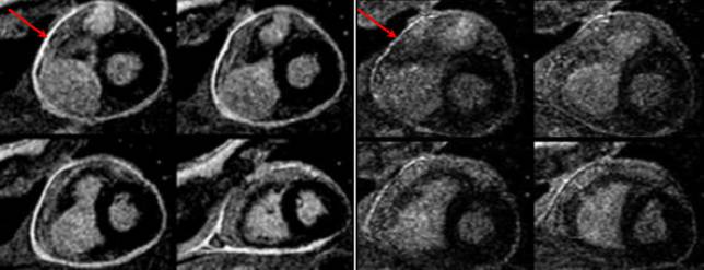 •After 6 weeks of prednisone therapy, the delayed enhancement was reduced (right).