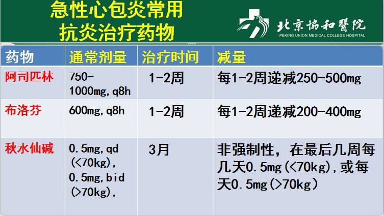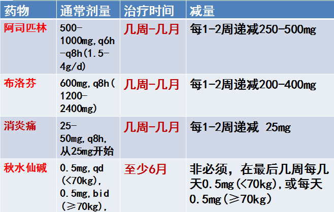 l三联治疗: 阿司匹林/ NSAIDs+秋水仙碱+糖皮质激素(低-中剂量)