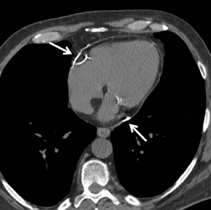 of linear pericardial calcification (white arrows) over the