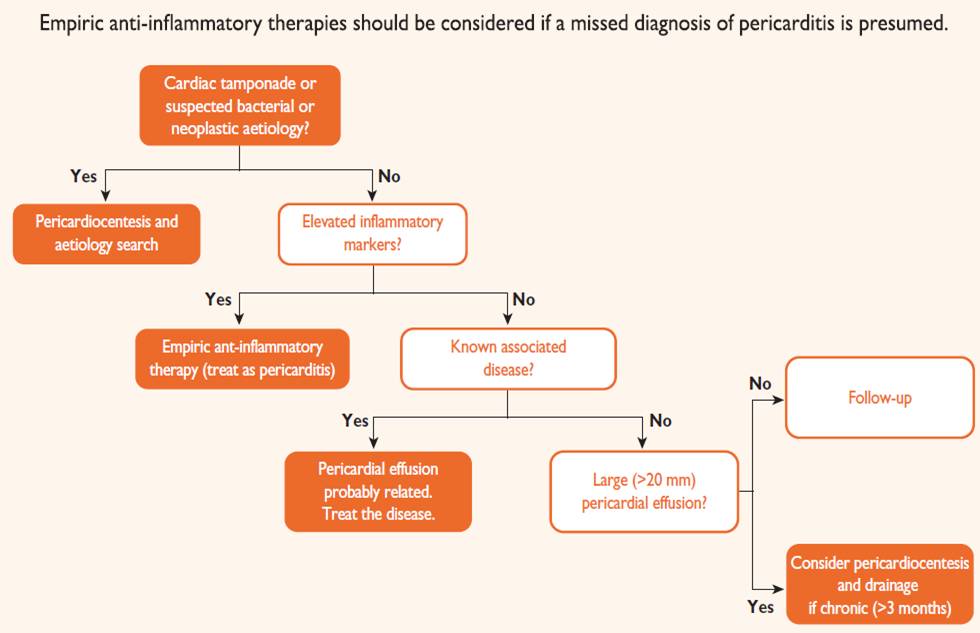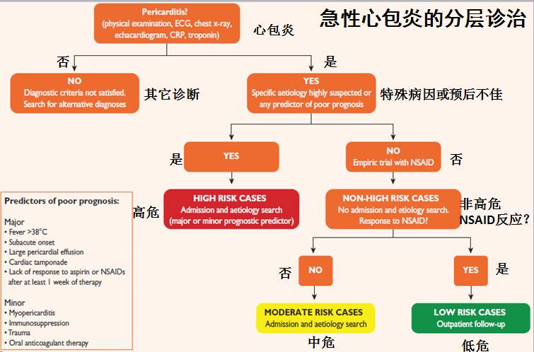 l寻找心包炎可识别和特殊治疗的病因的独立预测因素(包括细菌性,肿瘤性,系统性炎症性疾病)。主要因素包括发热>38度,亚急性过程(症状超过几天或几周),大量心包积液,心包填塞, 对阿司匹林或NSAIDs无效)。