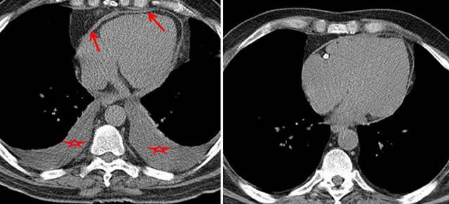 lCT或CMR:包裹性心包积液,心包增厚和肿物,胸部疾病