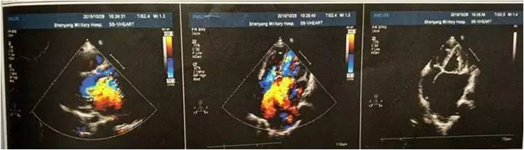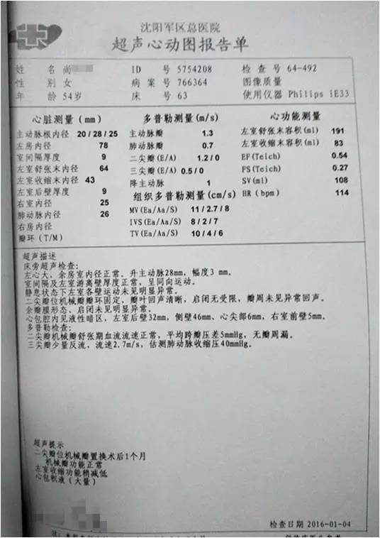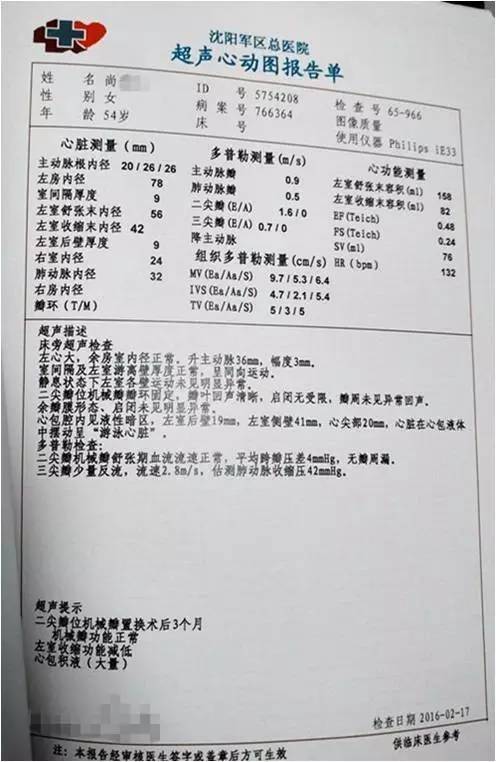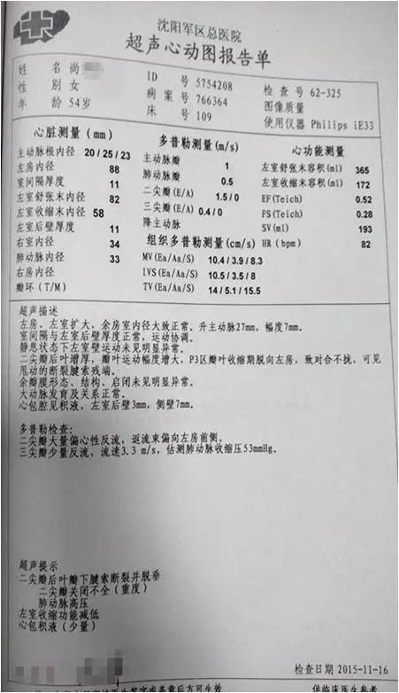超声提示二尖瓣后叶脱垂并重度关闭不全,二尖瓣后叶部分腱索呈“梿枷样”改变,提示二尖瓣后叶部分腱索断裂,三尖瓣中重度关闭不全,肺动脉高压(跨三尖瓣压差 53mmHg),心包积液少量。
