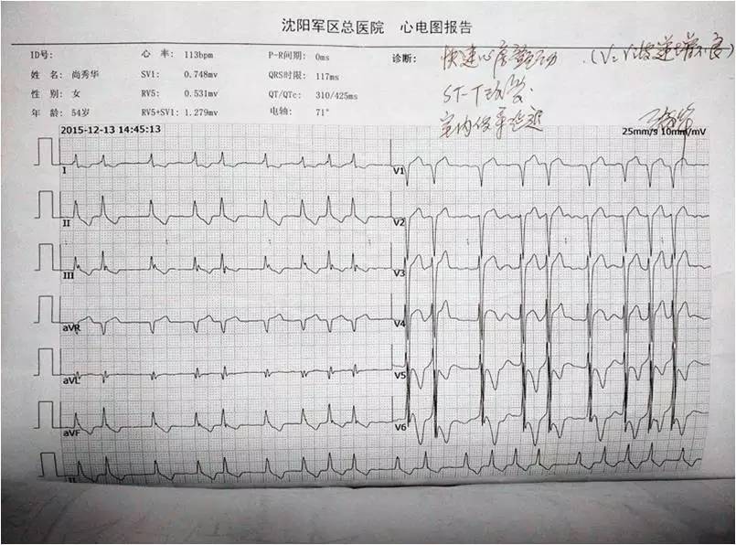 心电图示异位心律,快速性心房颤动,ST-T改变,室内传导延迟QRS117ms,HR113次/分。