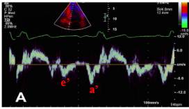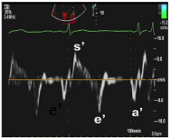 ●平均室间隔侧及侧壁侧e’均<9 cm/s