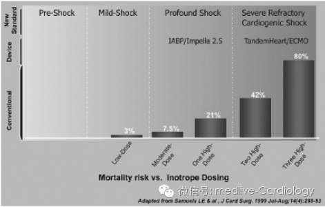 3、严重的休克:对大剂量正性肌力药物、缩血管药物或IABP有反应、LVAD