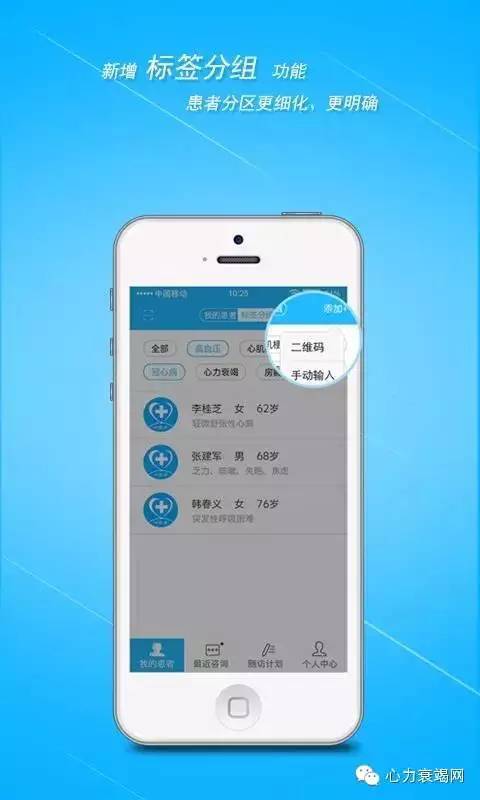 1、患者管理灵活:医生可以手动输入添加自己诊疗过的患者,也可以让患者通过微信扫描自己的二维码加入