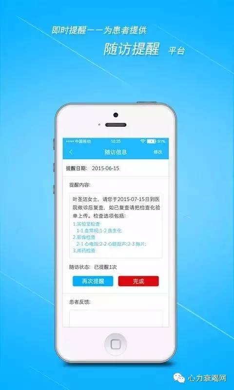 5、智能提醒:APP可根据医生制定的随访计划自动提醒医生对患者进行随访,同时,系统会通过微信提醒患者近期的随访计划