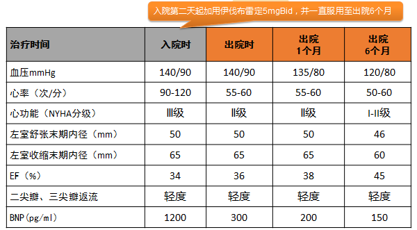 加用伊伐布雷定治疗后,患者的心率控制在55-60次/分钟,临床症状进一步改善, Iº房室传导阻滞得到改善,心电图ST段改变消失,心脏缩小,EF值上升