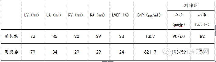 入院后患者后监测血压90-100/60mmHg,心率78-90次/分,给予盐酸曲美他嗪20mg 口服一天三次,辅酶Q10片0.01g 口服一天三次,螺内酯20mg 口服一天一次,呋塞米20mg 口服单日一次,托拉塞米胶囊10mg口服双日一次,氯化钾缓释片0.5g口服一天三次,培哚普利2mg 口服一天一次,酒石酸美托洛尔片12.5mg 口服一天两次,地高辛0.125mg 口服一天一次,同时给予多巴胺2ug/min/kg微量泵泵入,患者血压90-100/50-60mmHg,心率78-82次/分,仍有间断胸闷、气短症状,于4月23日予以加用左西孟旦12.5mg以0.1ug/min/kg微量泵泵入35小时,监测患者血压90-100/50-60mmHg,心率78-82次/分,症状逐渐改善,好转后出院。
