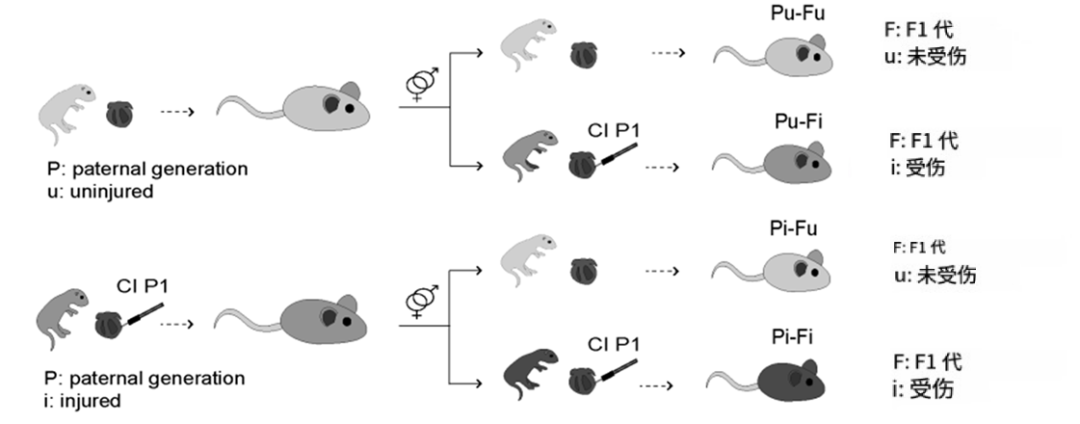 为了研究父代心脏损伤对下一代可能产生的影响,研究人员在雄性小鼠出生后第1天实施了心脏冷冻损伤处理。这种损伤模型已知诱导急性损伤并进行再生或形成瘢痕。之后,受伤雄鼠被饲养至成年,与未受伤雌鼠交配。作为对照组,选取来自相同遗传背景的同龄未受伤雄鼠,同样与未受伤雌鼠交配,获得第一代子代。