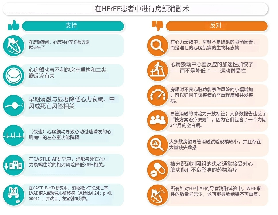 房颤 (AF) 与心力衰竭 (HF) 密切相关,尤其在慢性HF患者中,AF的发生与更差的预后相关,包括死亡率和卒中风险。对于这类患者,指南推荐的药物治疗(ARNI、ACEI、ARB、MRA等)可降低房颤复发率。而β受体阻滞剂的预后改善作用主要见于窦性心律患者,心房颤动患者获益较少。虽然SGLT2抑制剂对是否能减少AF事件仍不明确,但其在有AF的患者中对住院及死亡的益处仍然存在。当前关于是否应在HFrEF患者中常规进行AF消融,尚存在争议。CASTLE-AF和CASTLE-HTx等研究提供了一定证据支持早期消融,但批评声音指出这些研究样本小、方法学缺陷多。